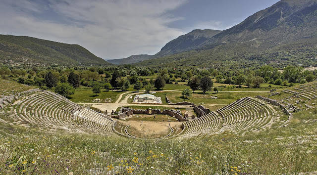 (Στη φωτογραφία : το αρχαίο θέατρο της Δωδώνης , υπέροχα ελληνικό κι επιβλητικά ωραίο, υποκλίνεται ,εντούτοις, μπροστά στη μεγαλοπρέπεια της Ολύτσικας , στο πλάι, που σκίζει νέφη κι αιθέρα...